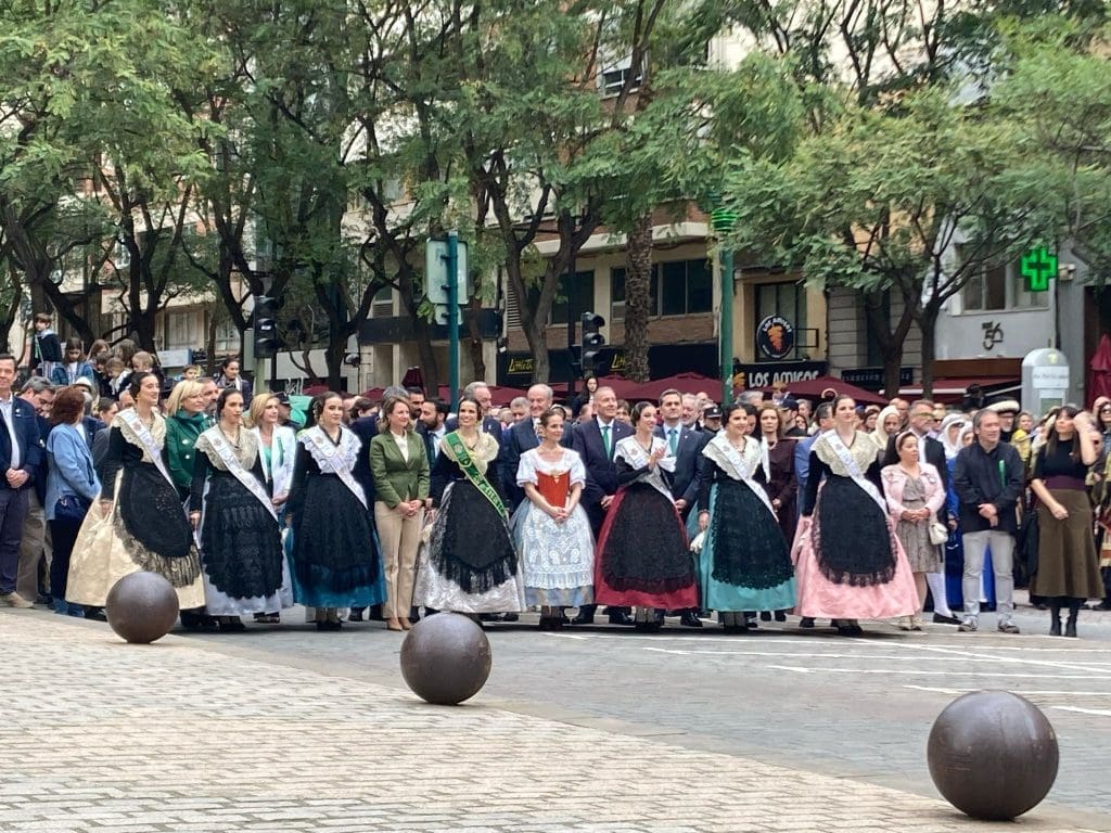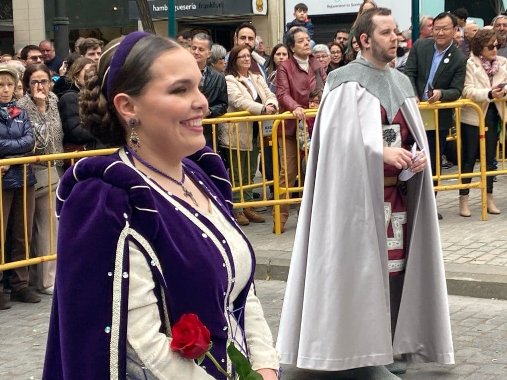 Resonar de los bombos y tambores, cruce de espadas, ofrendas con las rosas caballerescas a los pies de la imagen del conquistador y esa estampa que conforma un acto en que las dos reinas, María Rodríguez Santamaría, Na Violant d’Hongria 2024, y Lourdes Climent Moreno, Reina de las fiestas de Castelló, depositan junto a la alcaldesa, la corona de laurel.