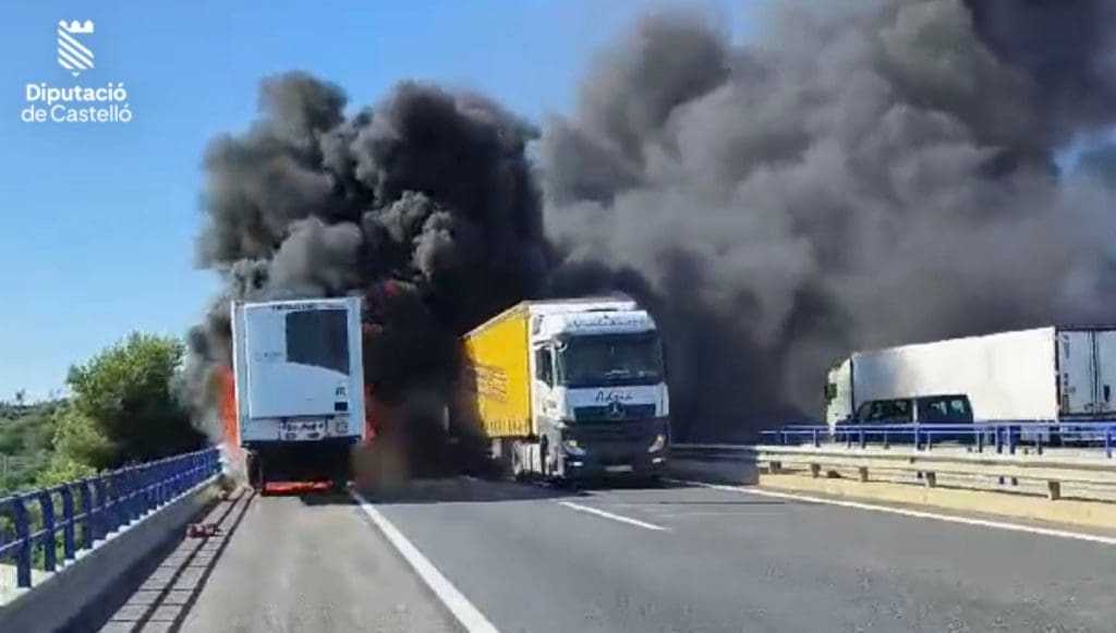 Según informan fuentes del Consorcio Provincial de Bomberos de la Diputación de Castelló, un remolque frigorífico articulado que transporta alimentación se encuentra ardiendo en la AP/ en concreto a la altura del término de Alcalà de Xivert.