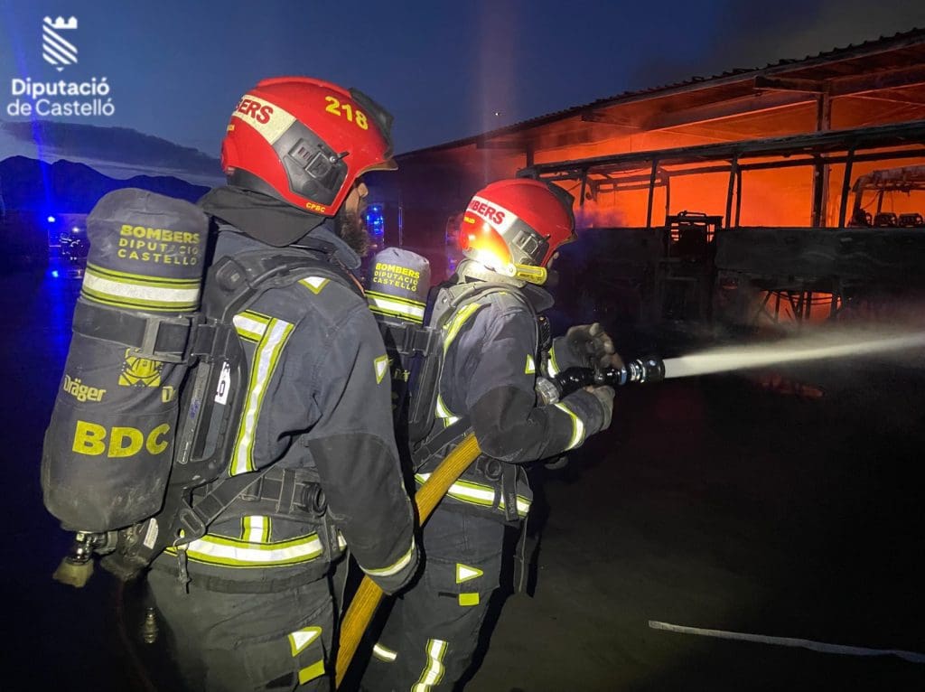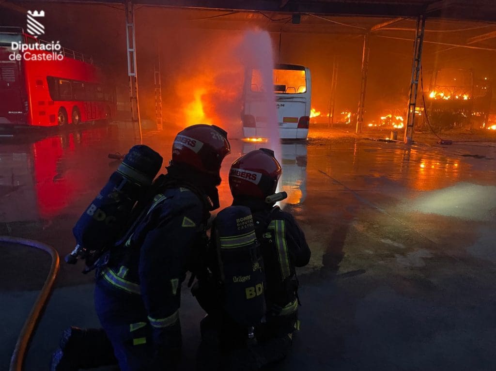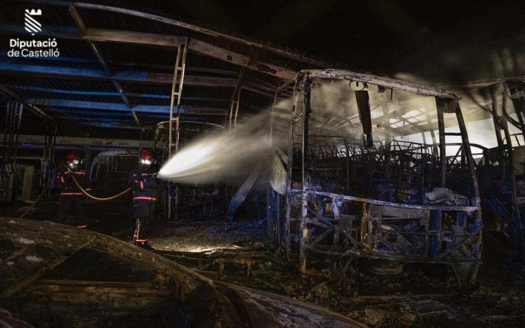 Efectivos del Consorcio Provincial de Bomberos de Castellón han extinguido este sábado un incendio declarado en un autobús aparcado en el interior de una empresa en la Vall d’Uixó. Las instalaciones han quedado arrasadas. El fuego ha calcinado por completo cinco buses y dos coches.