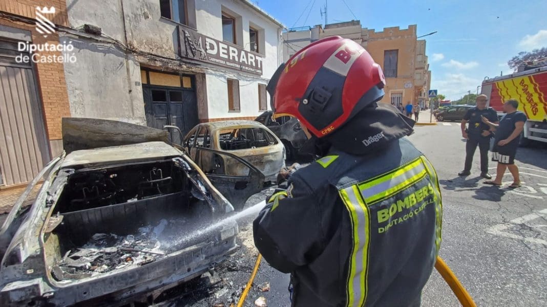Tres dotaciones del parque de la Plana Baixa se han desplazado hasta el lugar para sofocar el fuego, que ha afectado a varios vehículos estacionados en la vía pública y que se ha extendido a la fachada de un edificio próximo y de una carpintería. El incendio, no ha provocado daños personales y los bomberos han evitado que afectase a otras viviendas y empresas