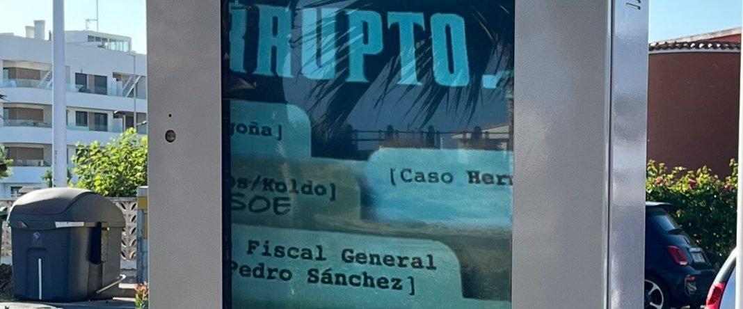 Mensajes que califican de 'corrupto' al presidente del Gobierno aparecen en los paneles informativos del paseo marítimo, generando críticas y exigencia de responsabilidades