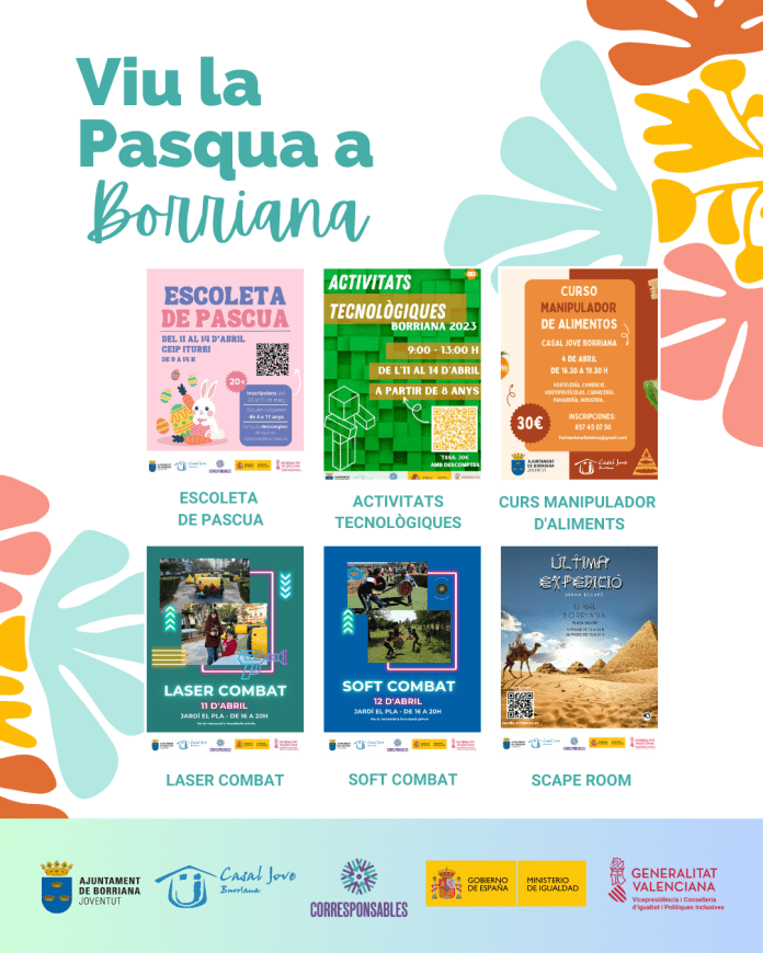 Las propuestas lanzadas por el área de Juventud municipal son la Escoleta de Pasqua, Escoleta de Pasqua Tecnológica, Soft Combat, Láser Combat, Scape Room y un Curso de Manipulador de Alimentos. Monferrer ha destacado que se trata de actividades “ajustadas a los propios intereses de los jóvenes y de las jóvenes con la finalidad de promover la formación, el ocio alternativo, educativo, igualitario y constructivo entre la juventud del municipio”.