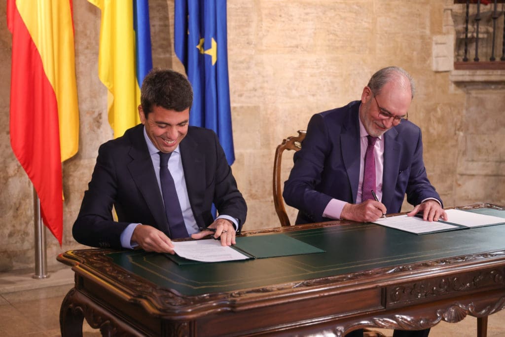 El presidente de la patronal azulejera española ASCER, Vicent Nomdedéu, ha sellado este miércoles el convenio con el jefe del Consell, Carlos Mazón, en el Palau de la Generalitat, en una firma a la que también ha asistido la presidenta de la Diputación de Castellón, Marta Barrachina.