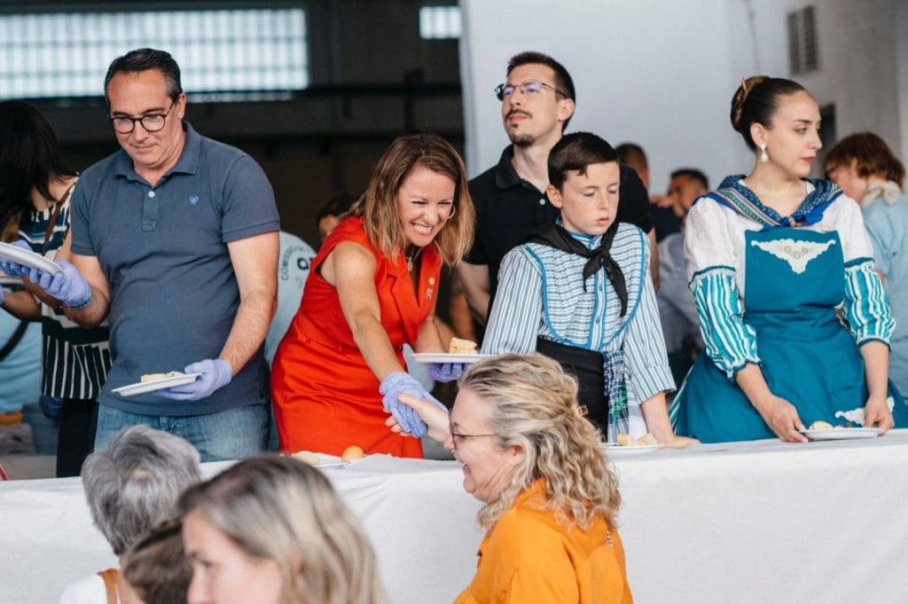 La alcaldesa de la ciudad, Begoña Carrasco, junto a la teniente de alcalde del Grao, Ester Giner; el concejal de Consumo, Alberto Vidal y otros concejales del gobierno municipal, ha participado este lunes en el reparto de la tradicional Torrà de la Sardina que se ha celebrado en la explanada de la Lonja.