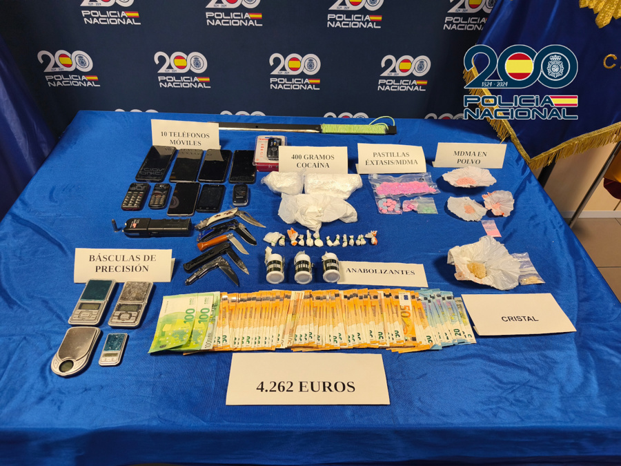 Durante el registro se incautaron 101,83 gramos de éxtasis en diferentes formatos, 394 gramos de cocaína, alrededor de diez gramos de marihuana y un gramo de hachís, además de 4.262 euros en efectivo. La variedad de presentaciones y la cantidad de droga apuntaban a una operativa orientada tanto a la venta al detalle como al suministro a terceros. A su vez, el dinero en metálico evidenciaba transacciones recientes.