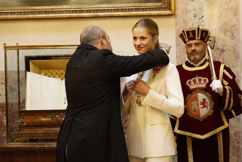 Acto seguido, la Sala de las Cortes Generales ha rendido un fuerte aplauso, que se ha prolongado durante casi cinco minutos, para la Princesa Leonor. Del mismo modo, la Princesa de Asturias ha recibido las medallas de cada del Congreso de los Diputados y el Senado de mano de sus presidentes, unas insignias que ha lucido durante toda la Jura el Rey Felipe VI, al igual que el Toisón de Oro.