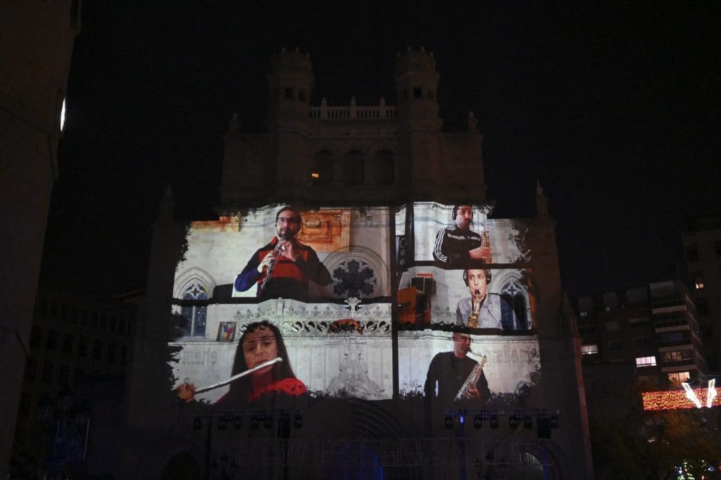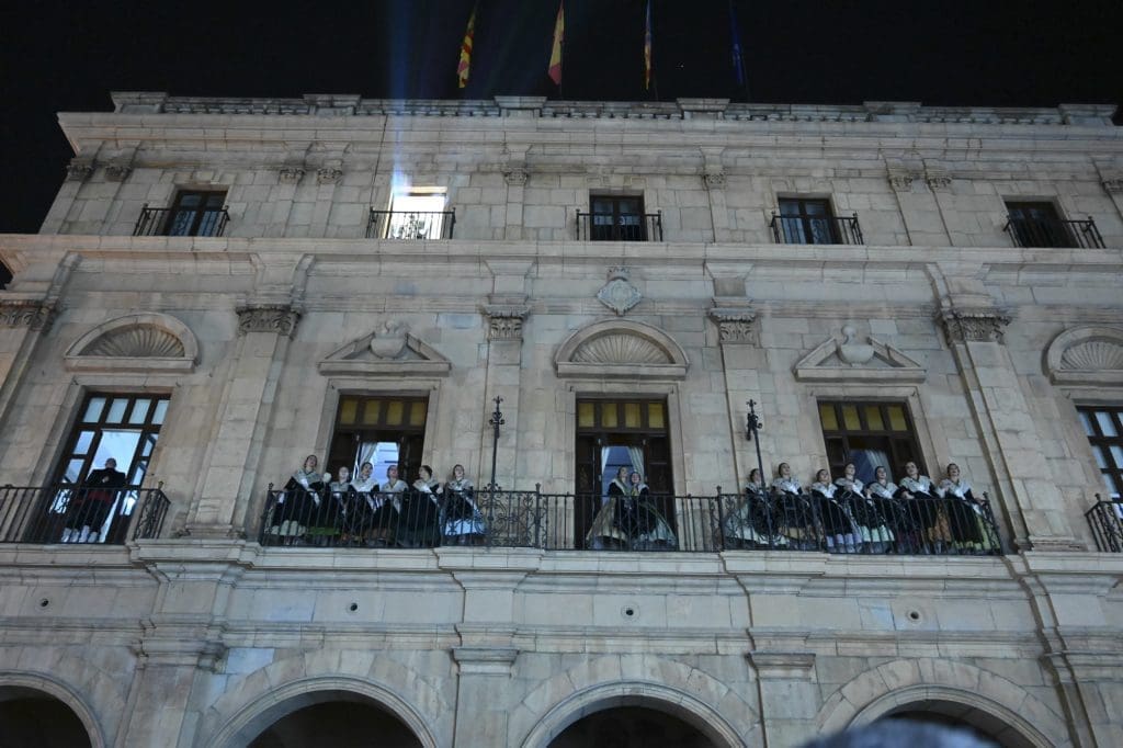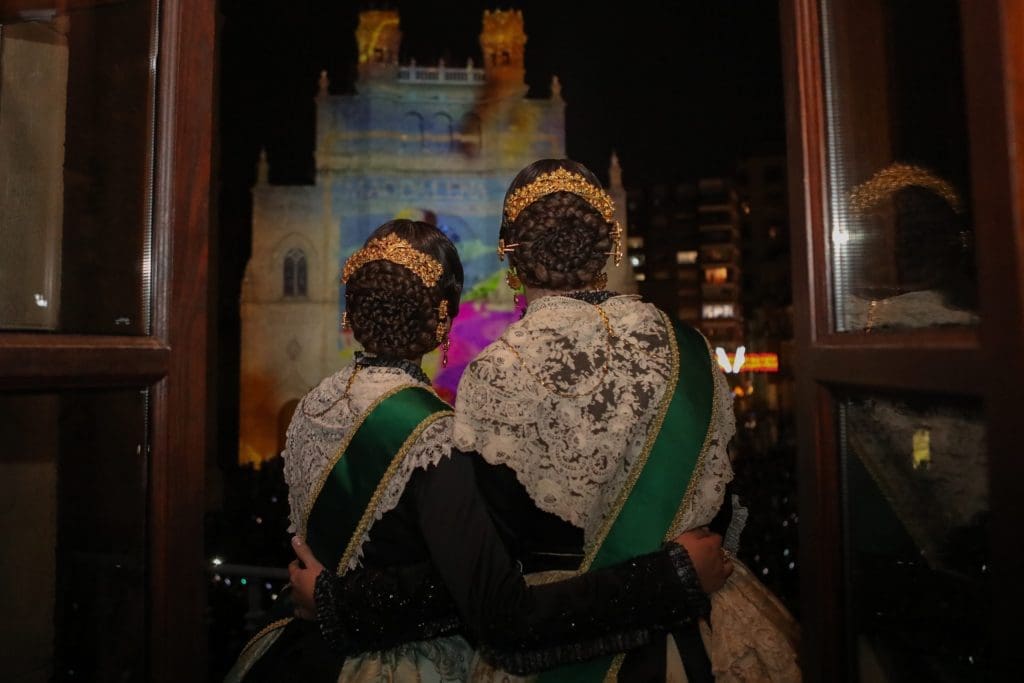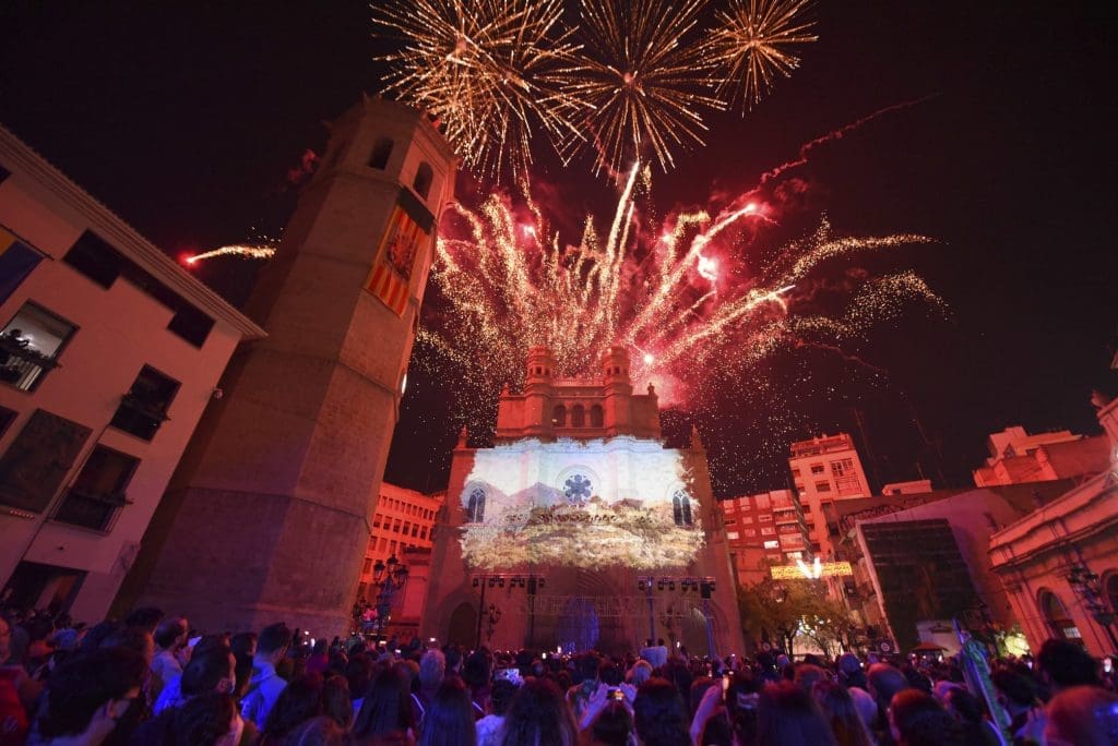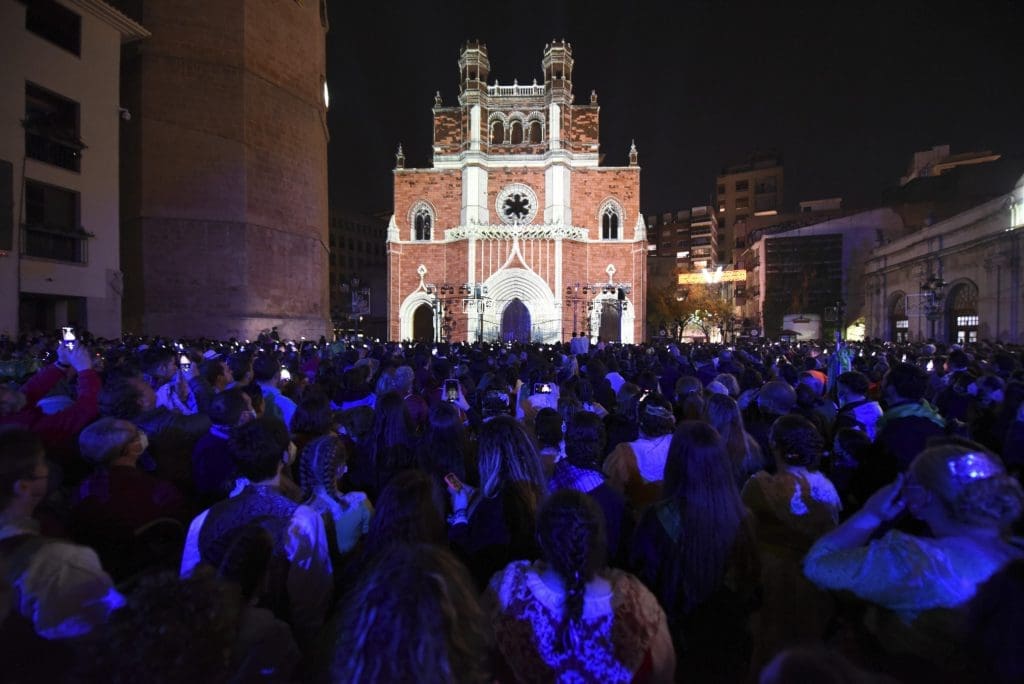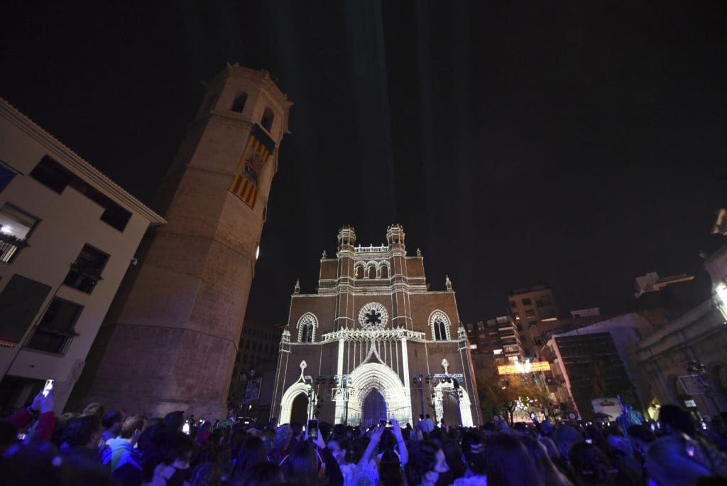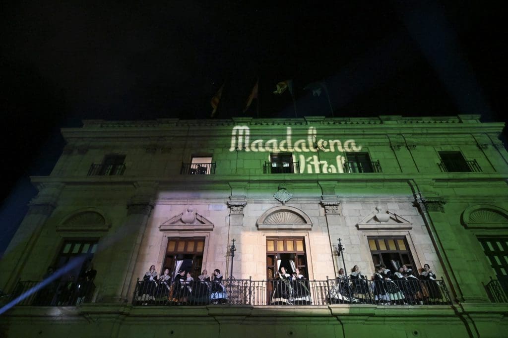 Tras el ansiado grito a la proyección de un videomapping sobre la fachada de la concatedral de Santa Maria. En ella se proyectaron primero los carteles de las anteriores 75 Magdalenas celebradas. Cabe recordar que en 2020 se debía haber celebrado la Magdalena del 75 anviersario y era un claro guiño a ‘no olvidar’ esta celebración que no pudo ser.