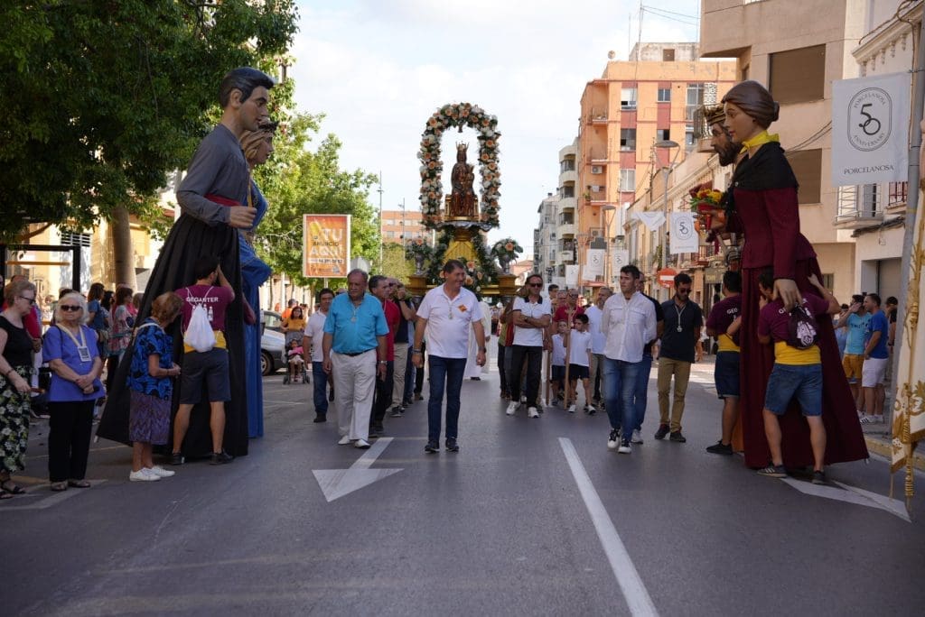 El cortejo estuvo compuesto por la Reina, Gracia Gumbau, acompañada de las damas, la corporación municipal, representantes de entidades festivas y muchos vecinos, que con devoción y alegría, han caminado junto a la imagen de su patrona hasta su hogar habitual.