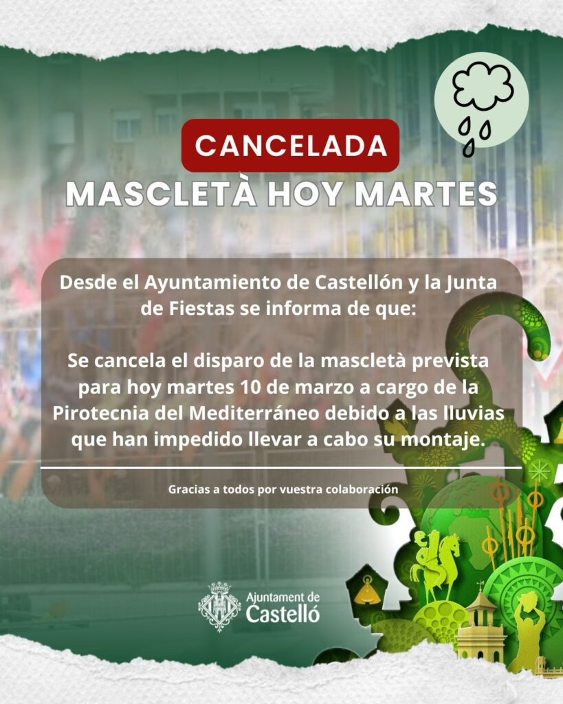 Las lluvias han obligado a suspender la mascletà prevista para este martes 10 de marzo en Castellón, que iba a disparar Pirotecnia del Mediterráneo. La cancelación se produce después de que la lluvia haya impedido llevar a cabo el montaje del espectáculo pirotécnico.