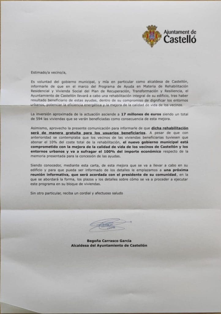 Son, como ya se fijo, 594 las viviendas beneficiarias correspondientes a los Grupos Rafalafena Tarongers, Cernuda y Velasco, Sequiol, José Antonio y Mediterráneo. «Un proyecto de gran envergadura con el que el Ayuntamiento va a invertir en los barrios de Castellón para mejorar sus condiciones de habitabilidad y su calidad de vida», ha reiterado hoy la actual alcaldesa igual que ya lo hiciera su antecesora al referirse a las mismas obras.