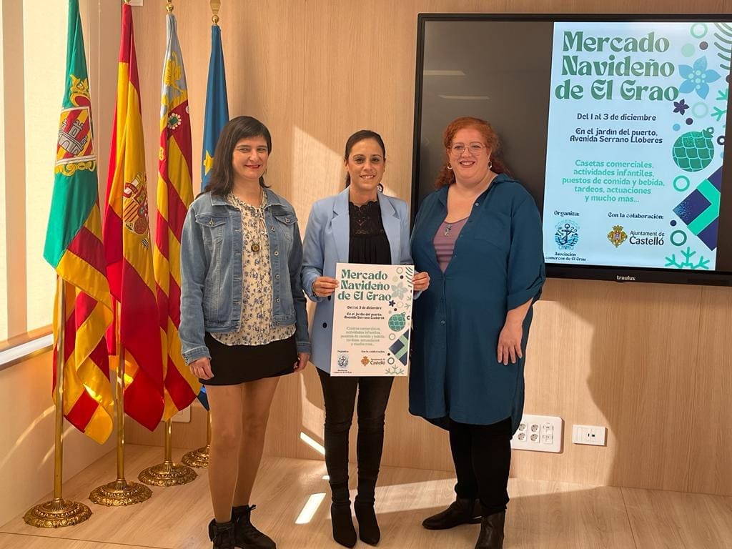 La teniente de alcalde, Ester Giner, junto a la presidenta de la Asociación de Comercios del Grao, Teresa Campos, y otras representantes, ha presentado hoy esta campaña que tendrá lugar del 1 al 3 de diciembre en el emblemático jardín del puerto, en la avenida Serrano Lloberas.