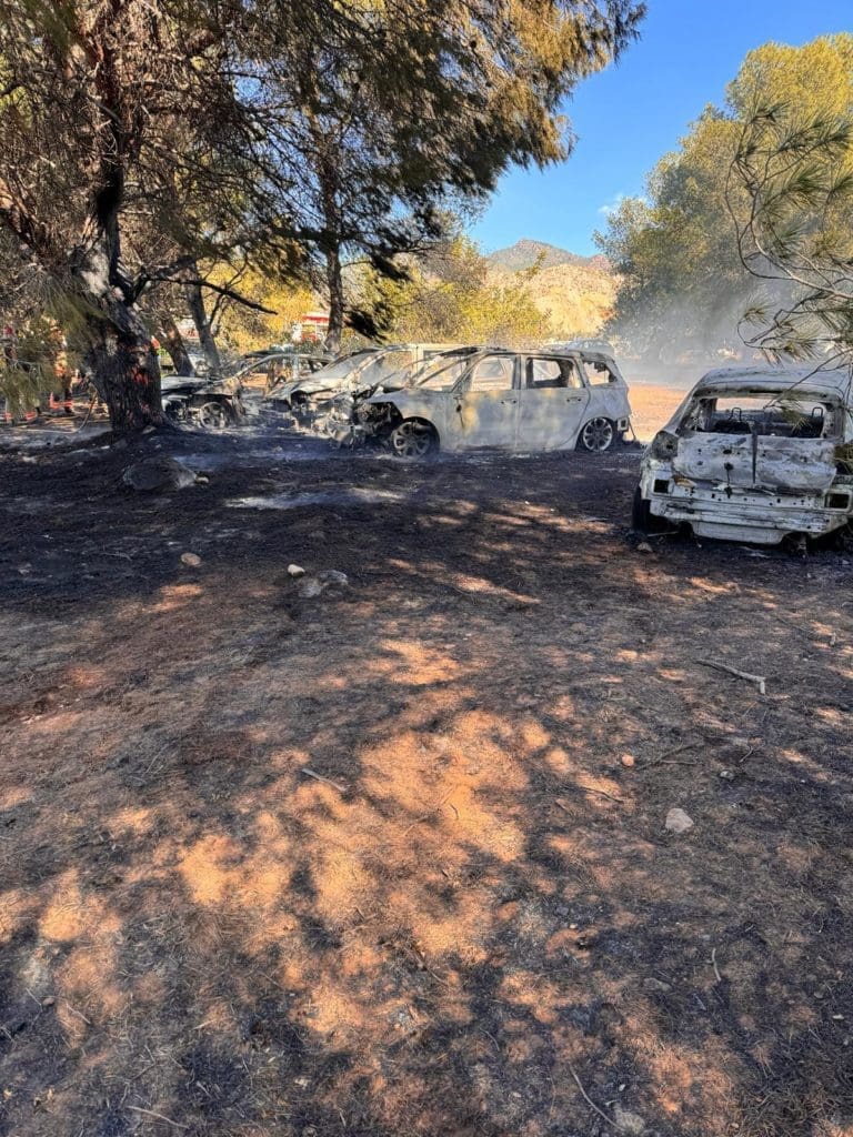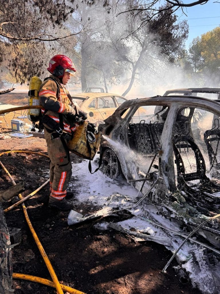 En la extinción del fuego de Fuente de la Reina que ha calcinado 12 vehículos además de los bomberos de Castellón también ha intervenido Policía Local y la agrupación de la Guardia Civil de Tráfico
