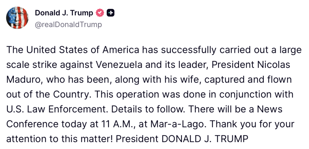 En un mensaje difundido horas después, Trump afirmó que “los Estados Unidos de América han llevado a cabo con éxito un ataque a gran escala contra Venezuela” y sostuvo que el presidente Nicolás Maduro “ha sido capturado y sacado del país por vía aérea”.