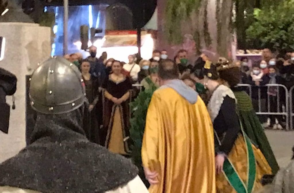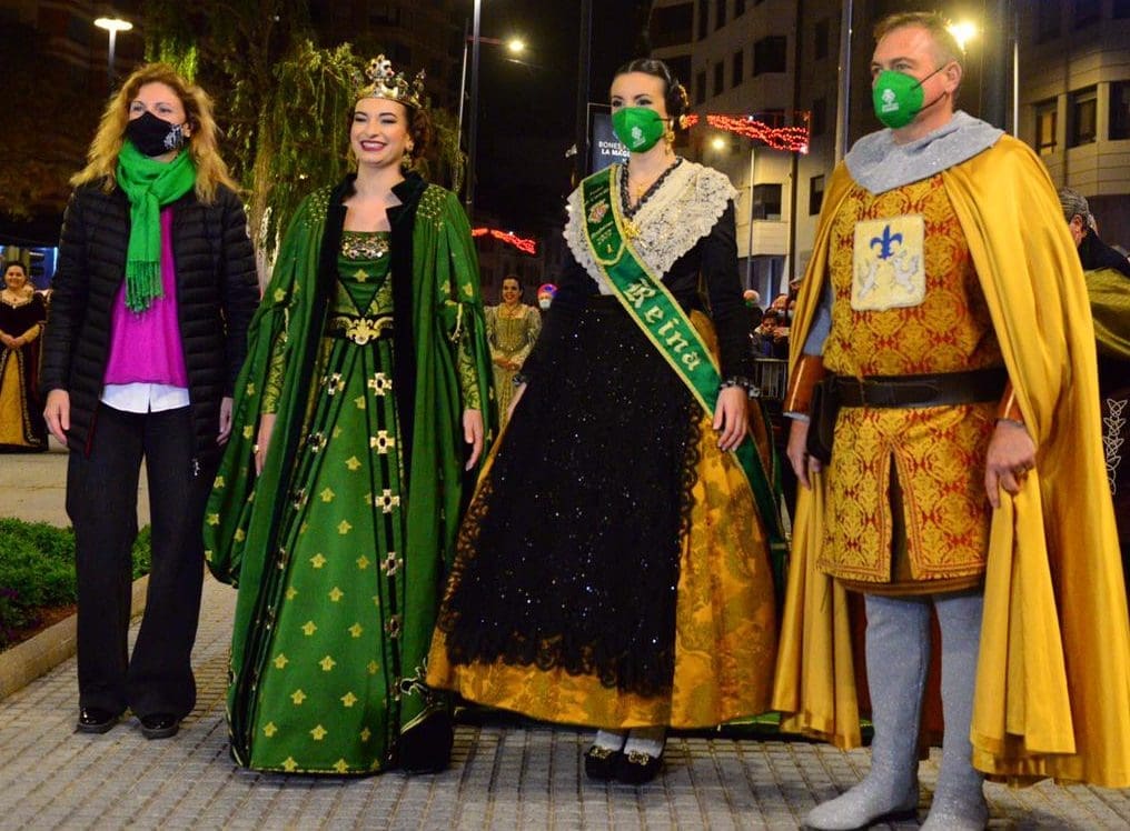 Precedida por el contundente e inconfundible tronar de los bombos y tambores, la comitiva real ha desfilado por Castelló para depositar flores y poemas en memoria de una reina. Una reina, a la que otras dos, Maria Torres, Reina Na Violant d’Hongria 2022, y Carmen Molina, Reina de las Fiestas de Castelló, ofrecían hoy tributo en forma de corona de laurel, acompañadas también por la reina infantil, Gal.la Calvo.