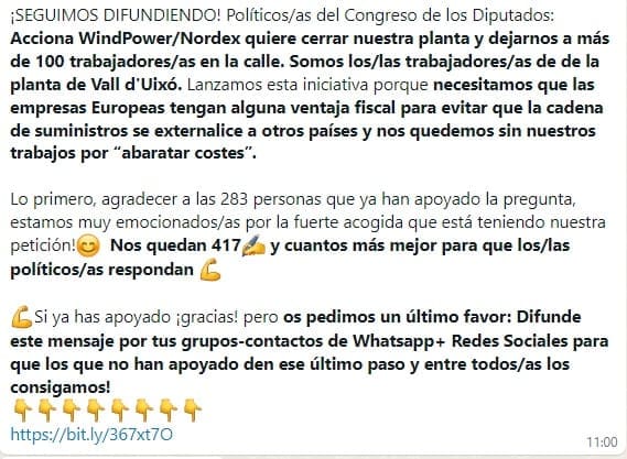 Por otro lado, cabe destacar que continúan las iniciativas para implicar a los políticos en su problemática. La última de ellas pasa por una recogida de firmas dirigida a plantear a los eurodiputados que incentiven ventajas fiscales para que las multinacionales no abandonen sus plantas de trabajo en España y migren a otros países.