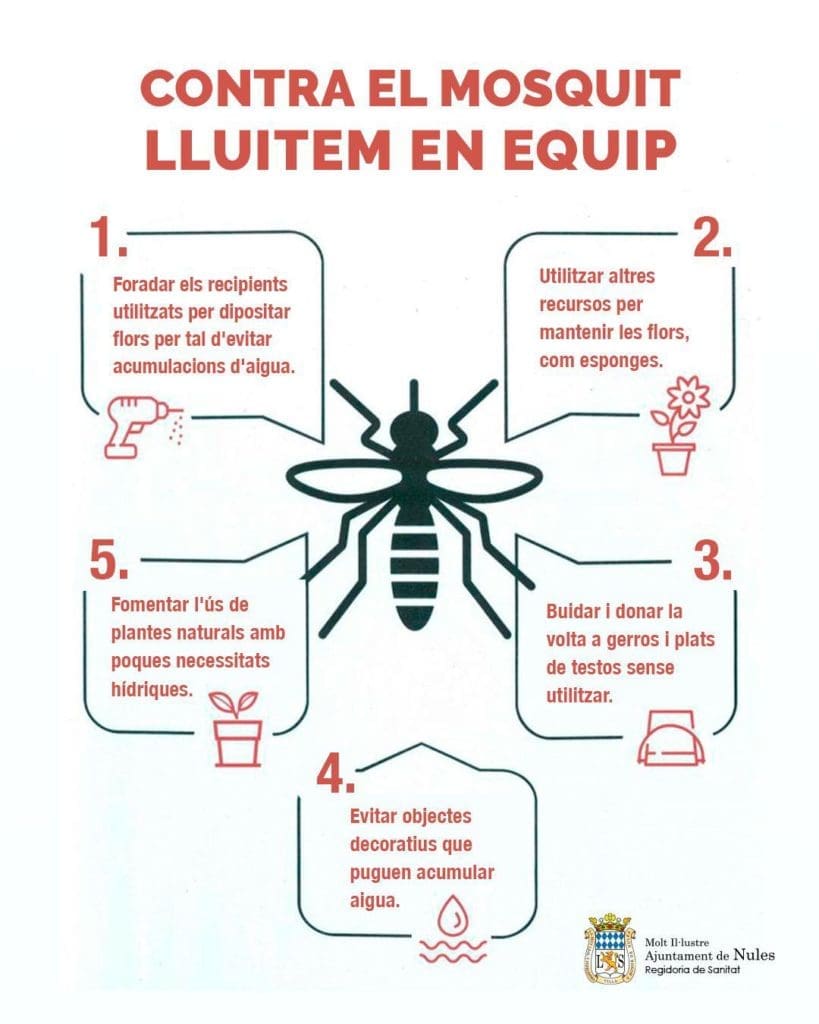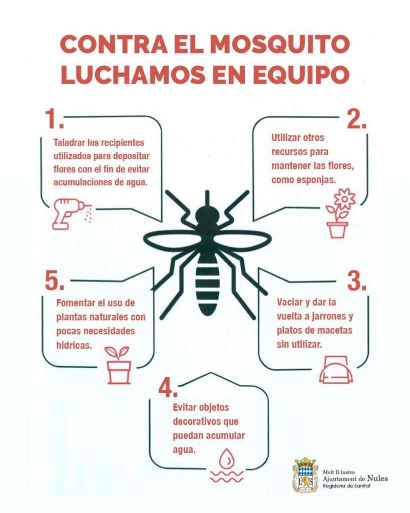 El Ayuntamiento de Nules ha puesto en marcha una nueva campaña de concienciación ciudadana para prevenir focos de mosquitos, así pues “Contra el mosquito luchamos en equipo” es el lema con el que se quiere acercar a la población diferentes recomendaciones para evitar la proliferación de mosquitos.