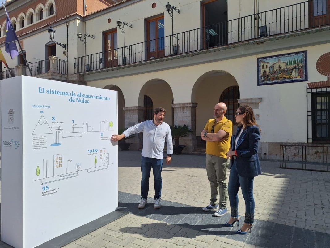 En este sentido, el Concejal del Ciclo Integral del Agua del municipio, Adrián Sorribes; el Concejal de Sanidad, Ramón Martínez; y la jefa de servicio y subdirectora de Gestión de Abonados y Mejora Continua de Facsa, Raquel Ginés, han visitado hoy una pequeña muestra instalada en un punto estratégico de la localidad, como es la Plaza Mayor de Nules.