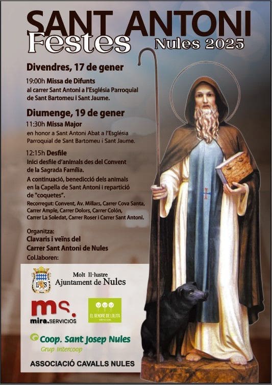 En concreto, el domingo, 19 de enero, el vecindario de Nules podrá disfrutar de los diferentes actos que organiza la Asociación de Vecinos y Devotos de San Antonio Abad con la celebración de la misa mayor y posterior desfile de animales, con la tradicional bendición y reparto de coquetes en la Capilla de San Antonio.