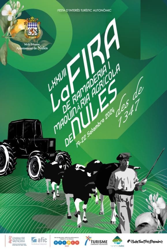 Nules celebra este año la 77 edición de la Fira de Ramaderia i Maquinària Agrícola, en concreto los días del 19 al 22 de septiembre tendrá lugar esta muestra que se remonta al año 1347, que es todo un referente del sector agrario en la Comunitat Valenciana, y que cuenta con el distintivo de Fiesta de Interés Turístico Autonómico.