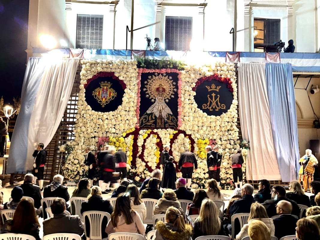 El tapiz de la Virgen ha sido uno de los elementos más comentados por los asistentes. Decorado por Alberto España, ha combinado claveles blancos con rosas, amarillos y rojos, creando una imagen floral en torno a tres elementos: la imagen de la Virgen, el escudo de Castellón a la izquierda y el símbolo del año mariano a la derecha.