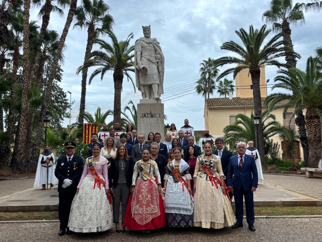 Tras la primera parte del acto, la comitiva se ha dirigido al monumento de Jaume I para rendir tributo al Conquistador y depositar la corona de laurel. Allí, la reina y damas también han realizado la tradicional ofrenda.