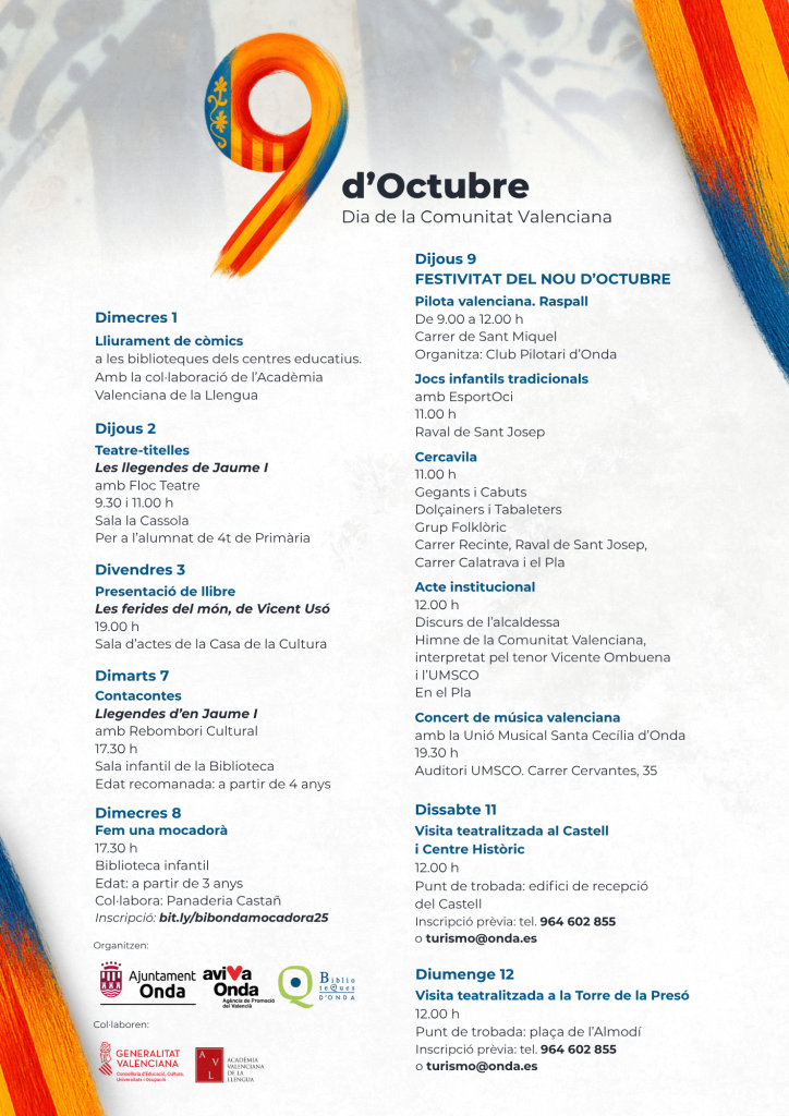 Con todo ello, Onda se prepara para vivir unos días de cultura, tradición y fiesta. El programa busca implicar tanto a los más pequeños como a los mayores. Así, se refuerza el orgullo de pertenecer a la Comunitat Valenciana mientras celebran en grande el 9 d’Octubre.