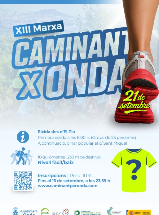 Las personas interesadas en participar en la duodécima edición de ‘Caminant per Onda’ pueden apuntarse, a partir de mañana, viernes 5 de septiembre, a las 12.00 horas, en la página web <http://www.caminantperonda.com/es/> por 10 euros. Las inscripciones permanecerán abiertas hasta el 15 de septiembre a las 23.59 horas o hasta agotar inscripciones y la recogida de camisetas tendrá lugar los días 18, 19 y 20, de 17 a 19 horas, en el Pabellón Víctor Cabedo (acceso por puerta principal).