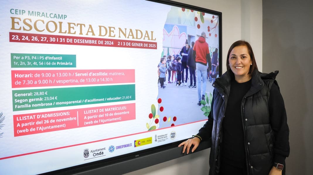 El Ayuntamiento de Onda, con el objetivo de facilitar la conciliación familiar durante las festividades de Navidad, ofrece una nueva edición de la Escoleta de Nadal, que tendrá lugar del 23 de diciembre de 2024 al 3 de enero de 2025, a excepción de los festivos nacionales 25 de diciembre y 1 de enero, en las instalaciones del CEIP Miralcamp.