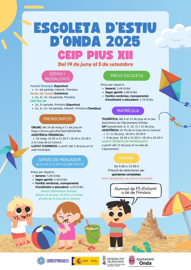 El Ayuntamiento de Onda lanza una nueva edición de la Escoleta de Verano con el objetivo de facilitar la conciliación laboral y familiar durante los meses de verano. Este servicio municipal se desarrollará del 19 de junio al 5 de septiembre, con una amplia oferta de actividades adaptadas a todas las edades.