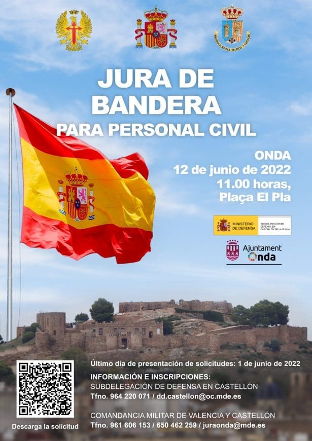 El Ministerio de Defensa ya ha abierto el plazo de inscripción para la jura de bandera para personal civil que tendrá lugar en Onda el próximo 12 de junio, un acto que estaba previsto para mayo de 2020 pero fue aplazado por la pandemia. Se trata de un solemne acto que reunirá a 500 jurandos y centenares de invitados en la plaza de El Pla en el que los ondenses y visitantes podrán reafirmar su compromiso con España y mostrar su apoyo a las fuerzas armadas.