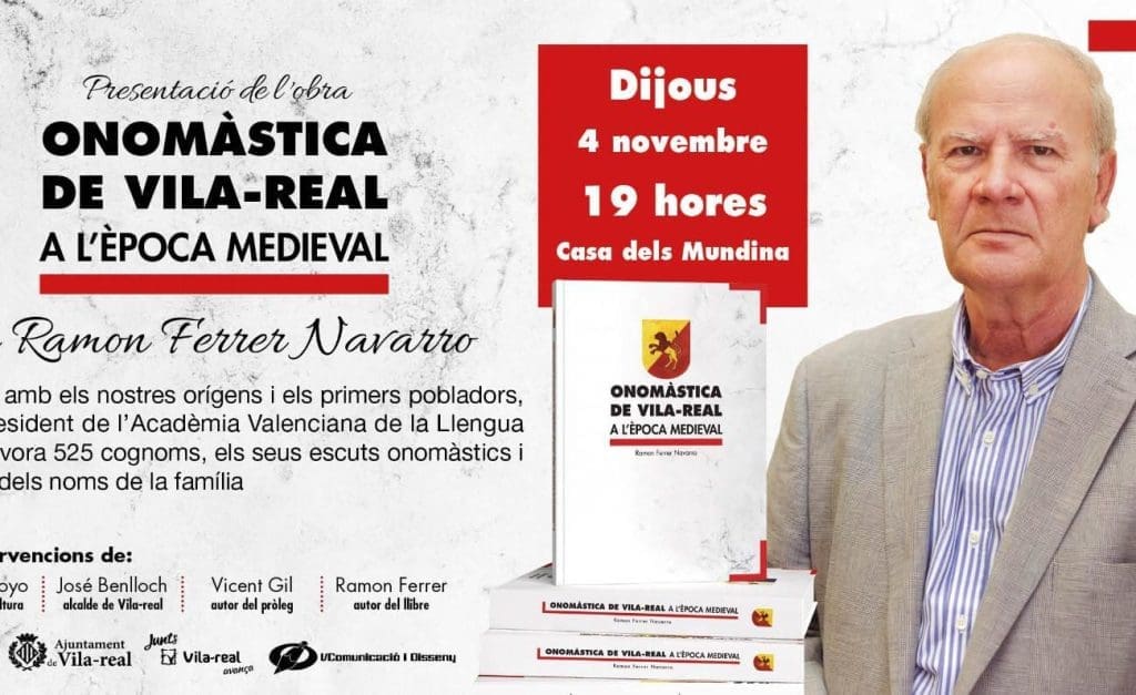 Por eso, ‘Onomàstica de Vila-real a l’època medieval’, es el libro que este jueves 4 de noviembre presentará Ramon Ferrer, presidente de l’Acadèmia Valenciana de la Llengua, (AVL) a las siete de la tarde en la Casa dels Mundina.