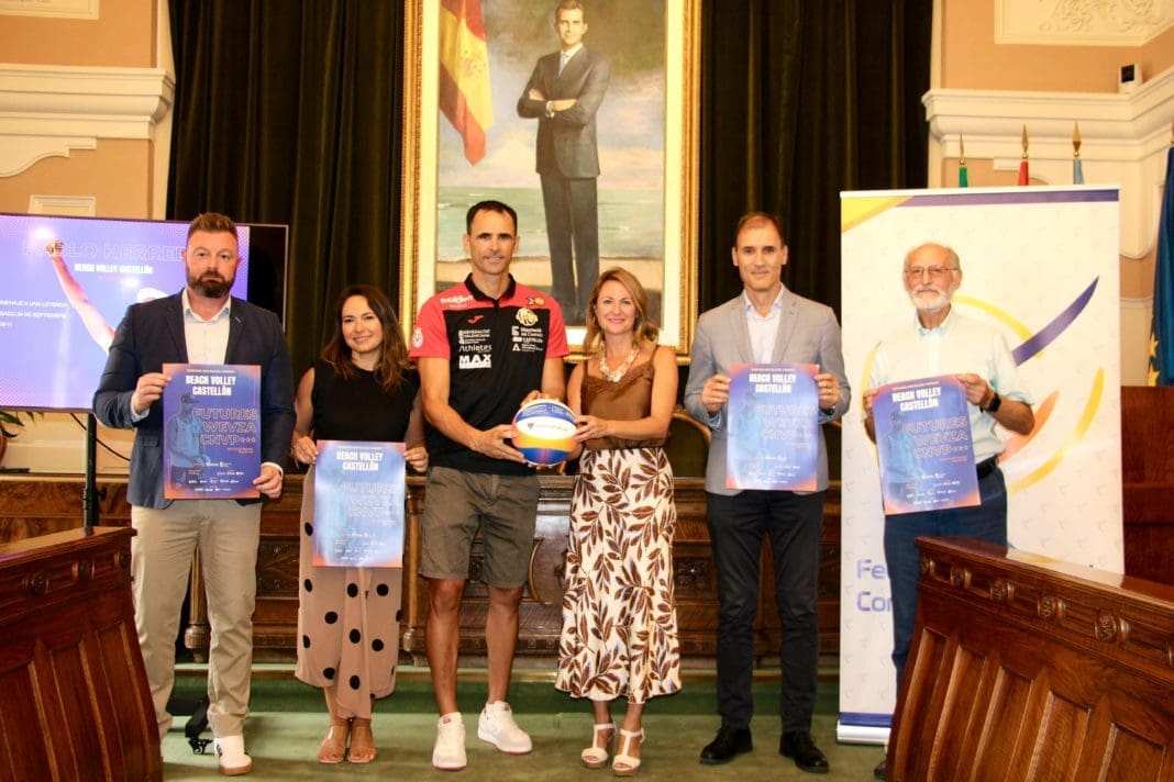 La alcaldesa de Castellón, Begoña Carrasco, acompañada del castellonense y medallista olímpico Pablo Herrerael Director General de Deportes de la Generalitat Valenciana, Luís Cervera, el Diputado Provincial de Deportes, Iván Sánchez, el Presidente de la Federación de Voleibol de la Comunitat Valenciana, Arturo Ruiz y la concejala de Deportes, Maica Hurtado ha presentado en salón de plenos del Ayuntamiento de Castellón el Campeonato Internacional Beach Volley Castellón que se celebrará en la playa del Pinar del Grao del 18 al 29 de septiembre.