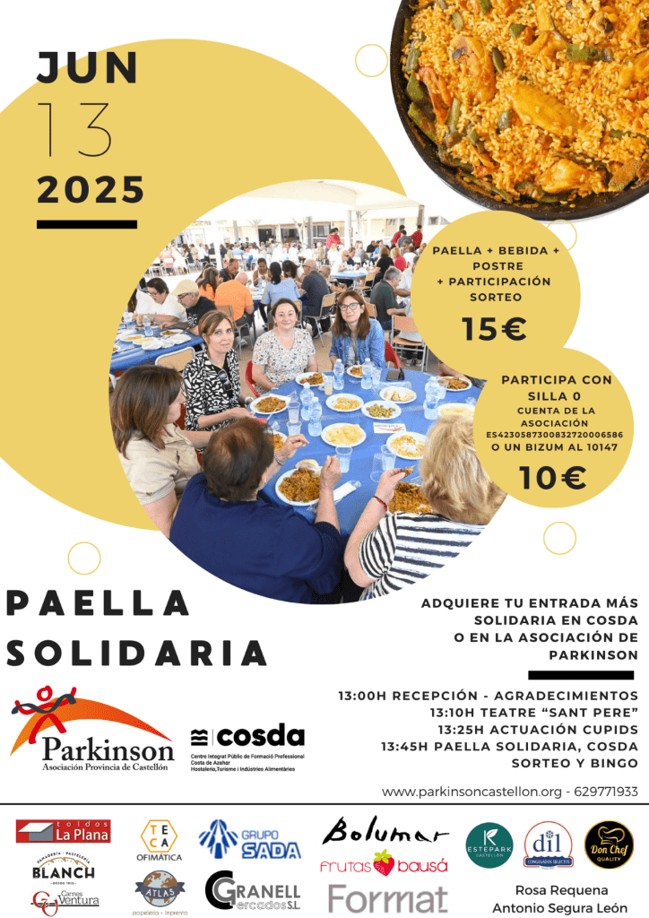 La Asociación de Parkinson de la Provincia de Castellón celebrará el próximo 13 de junio, en el centro COSDA de Castellón, la segunda edición de su Paella Solidaria. Este evento busca recaudar fondos vitales para mantener servicios de atención a pacientes afectados por esta enfermedad neurodegenerativa.