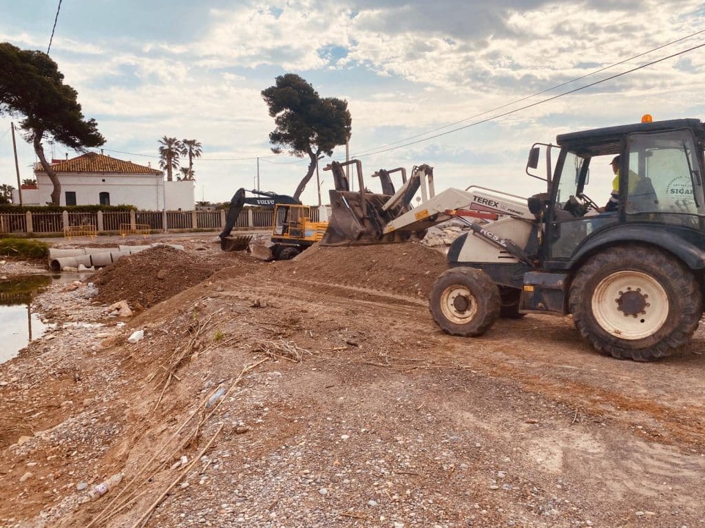 Una pala mecànica i operaris reposen aquest matí la passarel·la de terra en la desembocadura del riu Anna, al Clot, que dona accés a la zona dels Terrasses, després que el nivell de l’aigua ha descendit i les condicions han permès efectuar aquests treballs.