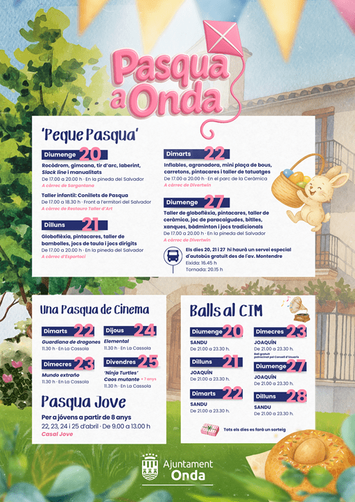 Onda se prepara para celebrar Pascua con una programación diseñada para todos los públicos, que combina ocio, cultura, tradición, naturaleza y música. Desde el 13 hasta el 28 de abril, vecinos y visitantes podrán disfrutar de más de 20 actividades en distintos espacios del municipio.