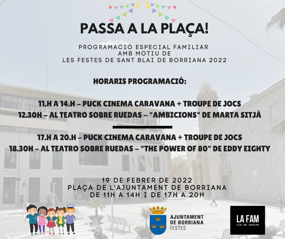 El Ayuntamiento, a través de la Concejalía de Fiestas, ha organizado una programación familiar especial enmarcada en las fiestas de Sant Blai de este año y que bajo el nombre “Passa a la Plaça” incluirá un amplio abanico de actividades gratuitas y abiertas durante toda la jornada el sábado 19 de febrero en el centro de la ciudad.