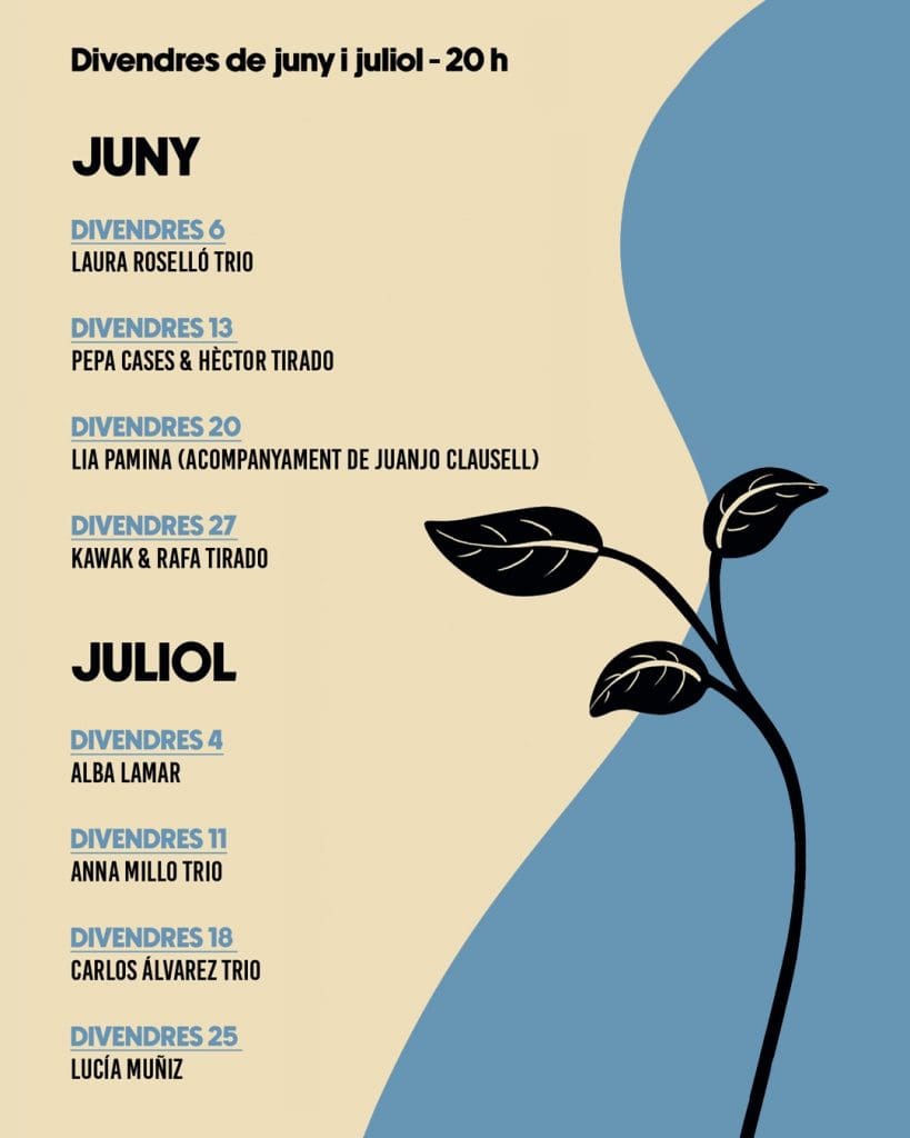 Desde el 6 de junio al 25 de julio, el público podrá disfrutar de las actuaciones de Pepa Cases y Héctor Tirado, Lia Pamina y Juanjo Clausell, Kawak y Rafa Tirado, Alba Lamar, Anna Millo, Carlos Álvarez y Lucía Muñiz. Una cuidada selección de algunos de los músicos más destacados de la escena castellonense, que además presentarán sus nuevas producciones discográficas.