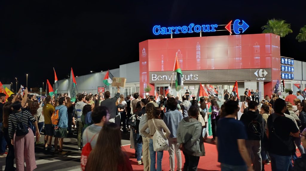 La jornada comenzó con piquetes informativos en la capital de La Plana. Fueron previstos inicialmente frente al Carrefour Express, empresa señalada por el movimiento BDS. La acusan por su supuesta vinculación con el “financiamiento del genocidio perpetrado por el Estado de Israel”.