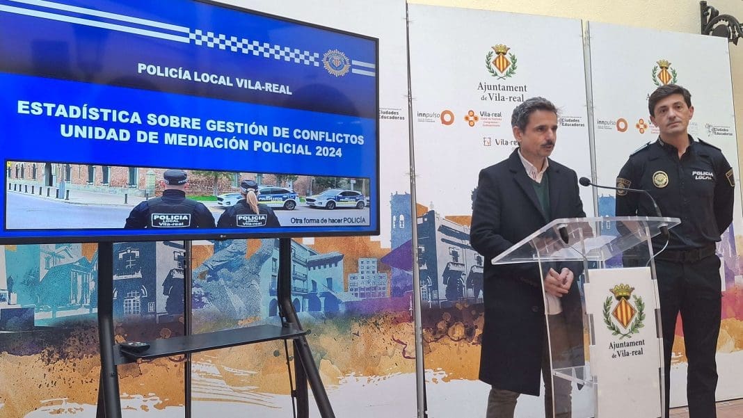 La Unidad de Mediación Policial de Vila-real (UMEPOL) actuó en 88 casos durante 2024, 36 gestionados por integrantes de la Policía Rural y los 52 restantes correspondientes a Policía de Barrio (comunitaria). El concejal de Seguridad Pública y Emergencias de Vila-real, Toni Marín, y el inspector de Policía Local encargado de la unidad de Mediación Policial, Óscar López, han presentado esta mañana el balance de las actuaciones realizadas en 2024 en el ámbito de la mediación policial que ha conseguido zanjar los conflictos de forma satisfactoria en la mayoría de las situaciones.