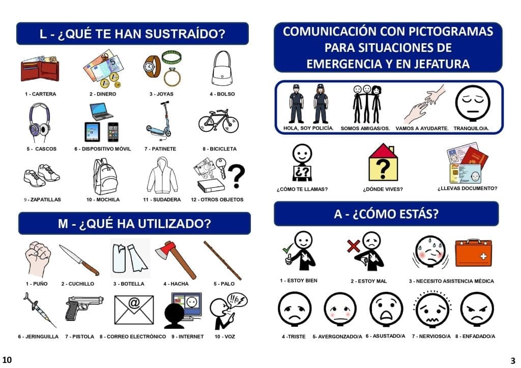 Con este objetivo, se ha distribuido entre todos los miembros de la Policía Local un cuadernillo con pictogramas que pueden utilizar en diferente situaciones de emergencia. El cuaderno ha sido elaborado a partir de la colaboración del Cuerpo Nacional de Policía y del Centro Aragonés de la Comunicación Aumentativa y Alternativa (ARASAAC).