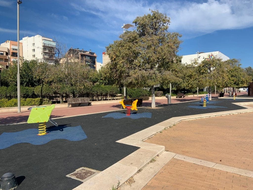 Estas actuaciones tienen como objeto principal la mejora de la seguridad, y por ello se ha sustituido el pavimento existente por uno absorbedor de impactos, tanto en el suelo ocupado por tobogán y muelles como en el perímetro del mural cerámico.