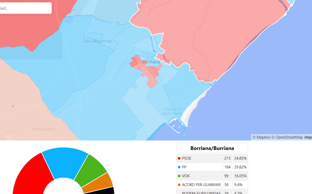 Las elecciones del pasado domingo marcaron un cambio de color en Burriana. La capital de la Plana Baixa se tiñó de azul en gran parte, aunque varias zonas de la localidad mantuvieron el voto socialista. El mapa de secciones interactivo que podemos encontrar en esta misma página, confeccionado para Actualitat Valenciana, dibuja de forma detallada los resultados en las mesas electorales de cada distrito del territorio.
