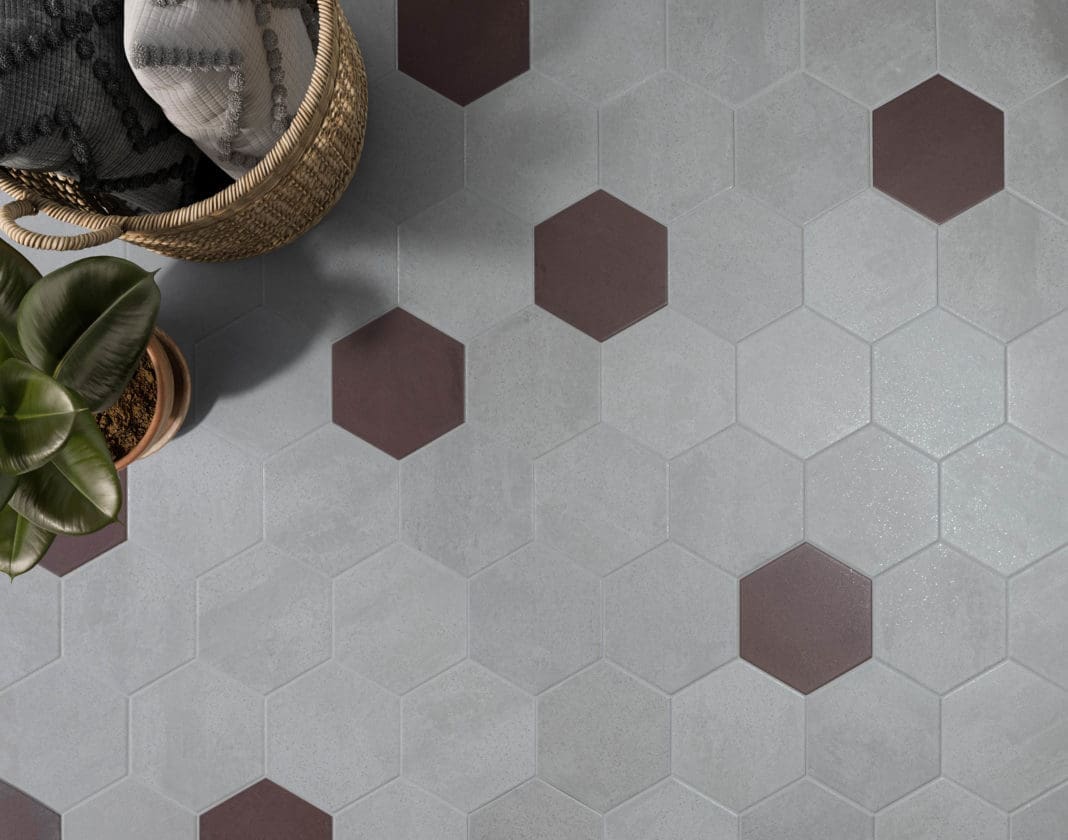 Otra de las apuestas de la firma cerámica, es la renovada gráfica aplicada en las piezas hexagonales de formato pequeño y las de 20X20 cm., todas ellas en porcelánico. El gris cementoso se combina con los colores tendencia como el burdeos, el marine y el olive. Las gráficas generan rosetones y estrellas de diferentes tonalidades y dimensiones con una gran capacidad decorativa.