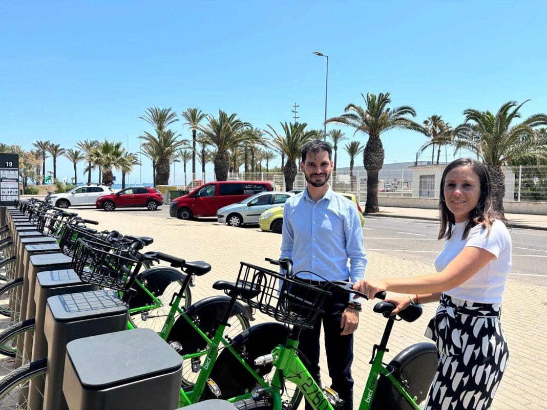 El concejal de Movilidad del Ayuntamiento de Castellón, Cristian Ramírez, junto a la teniente alcalde del Grao, Ester Giner, ha comprobado como se ha llevado a cabo la reciente ampliación de las bases del servicio Bicicas en las estaciones de la Avenida Ferrandis Salvador y el Planetario para este verano.