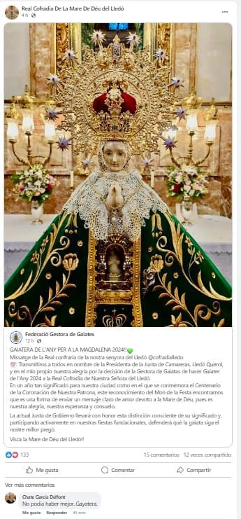 : Transmitiros a todos en nombre de la Presidenta de la Junta de Camareras, Lledó Querol, y en el mío propio nuestra alegría por la decisión de la Gestora de Gaiatas de hacer Gaiater de l’Any 2024 a la Real Cofradía de Nuestra Señora del Lledó.
