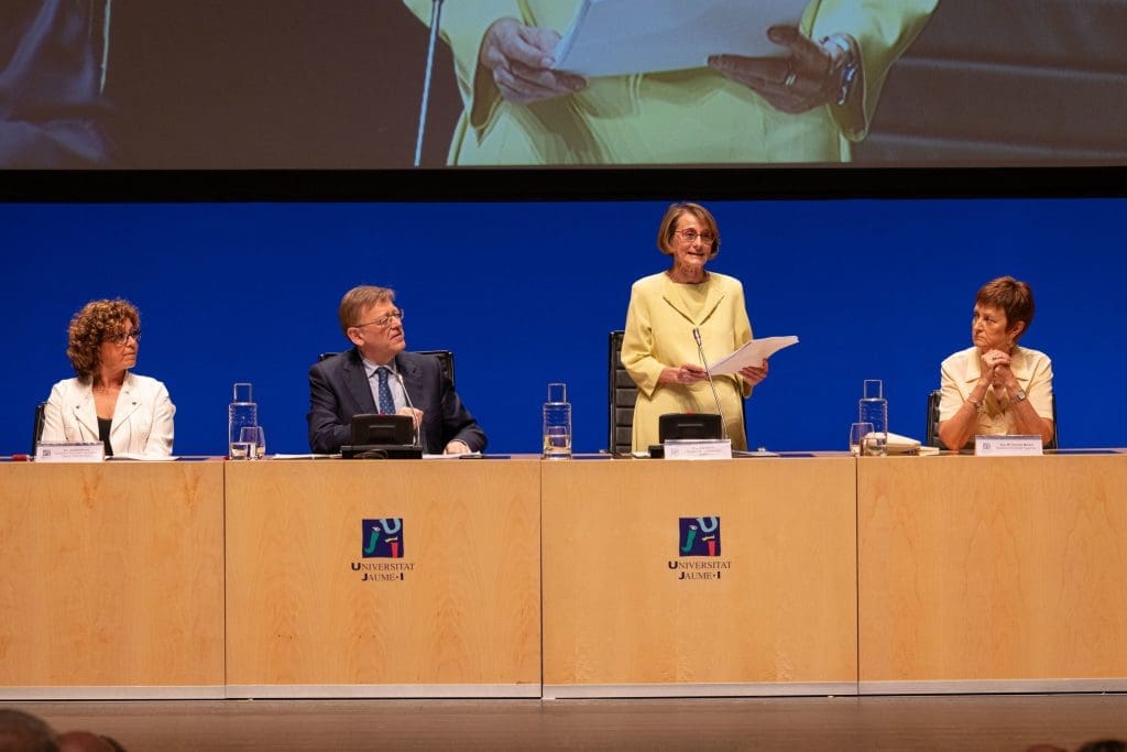Durante su intervención, Eva Alcón ha destacado que vuelve a asumir el cargo de rectora de la UJI «convencida de que tenemos margen para impulsar, desde la universidad, los cambios que necesitamos como sociedad. Y además, con la certeza de que la mejor manera de conseguirlo es con el compromiso de sumar dentro y fuera de la comunidad universitaria».