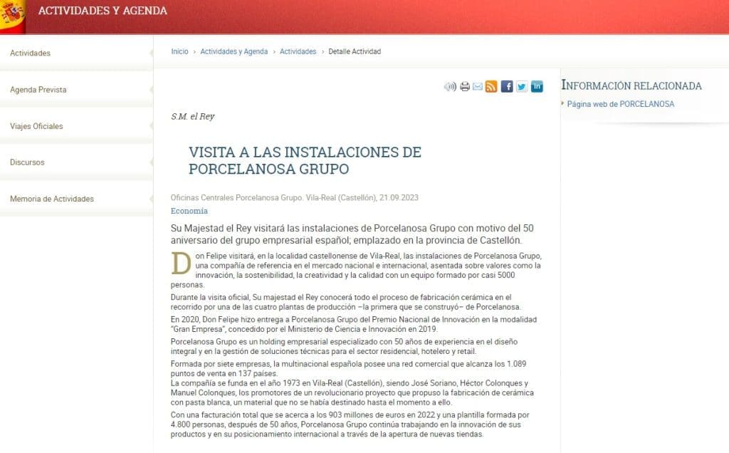 Según la previsión en la agenda dela Casa Real, «Durante la visita oficial, Su majestad el Rey conocerá todo el proceso de fabricación cerámica en el recorrido por una de las cuatro plantas de producción –la primera que se construyó– de Porcelanosa».