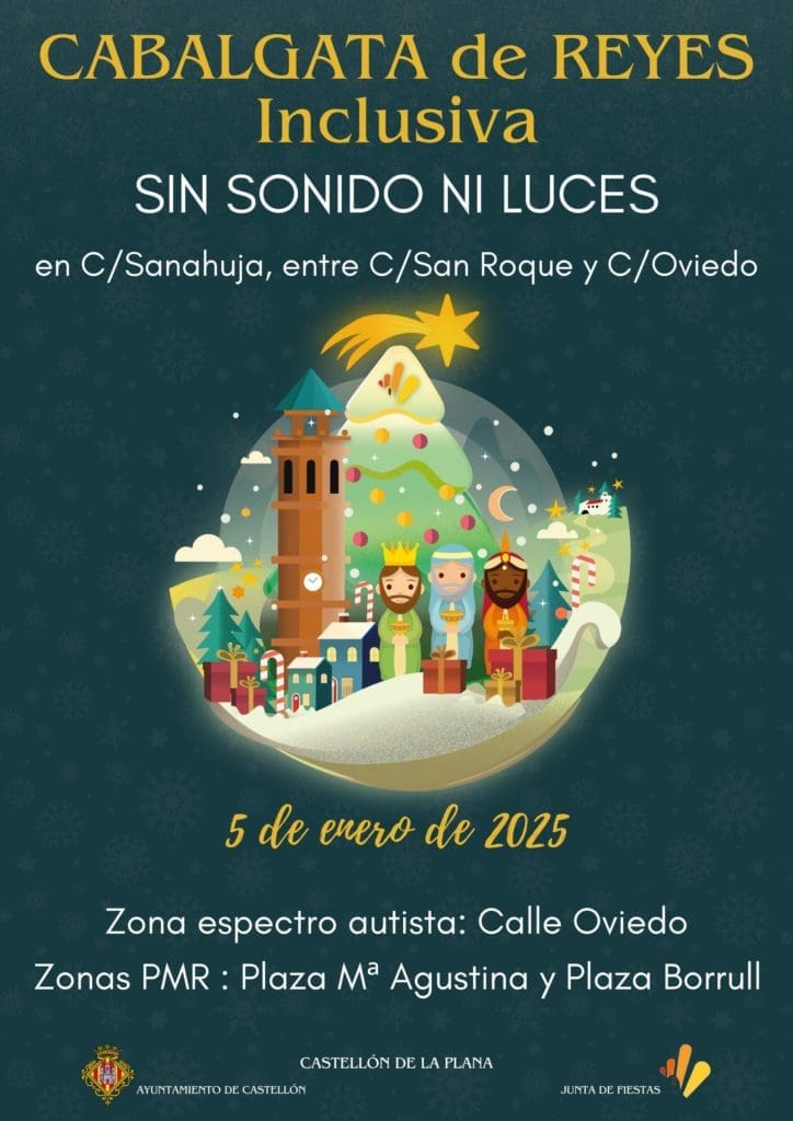 Con una ‘zona de la calma‘, con baja carga sensorial, es decir, sin luces ni música, para que todos puedan disfrutar de la llegada de los Reyes, que se concentrará desde la calle Sanahauja hasta las proximidades de la plaza Maria Agustina, tras el cruce de San Roque con la calle Oviedo, se iniciará este año la cabalgata oficial del 5 de enero en la capital de la Plana.
