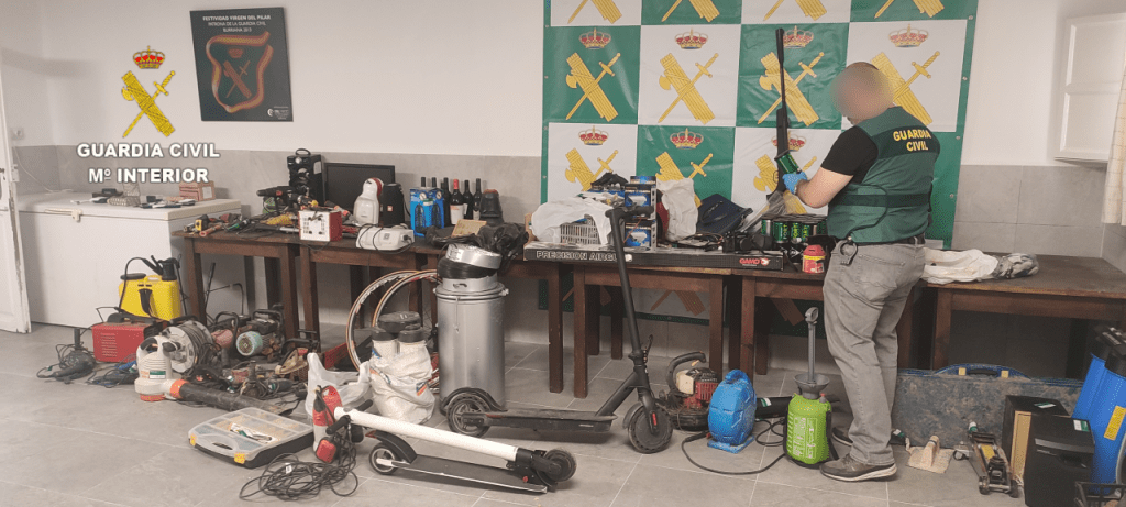 La Guardia Civil realizó un registro debidamente autorizado en el interior del inmueble dando como resultado la recuperación de numerosos objetos, posiblemente procedentes de ilícitos penales cometidos en la zona, entre los que se encuentran varios relojes, joyas, herramientas, aperos de hípica, electrodomésticos, patinetes eléctricos, ropa envasada y etiquetada y diversos efectos personales, con un valor aproximado de 30.000 euros.