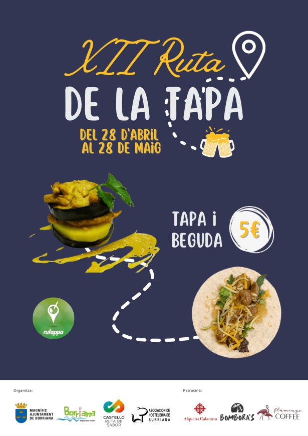 Arranca la XII Ruta de la Tapa de Burriana, una nueva edición de la consolidada propuesta gastronómica del Ayuntamiento de Burriana, en la que este año participan 13 bares y restaurantes de la localidad ofreciendo sus propuestas gastronómicas junto a una bebida por tan solo 5 euros.